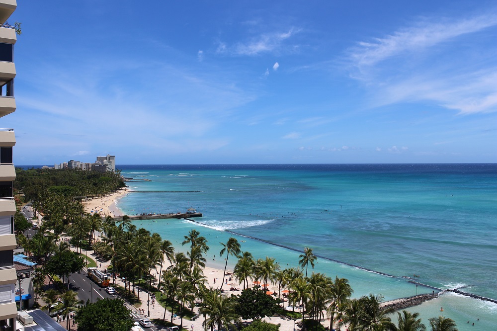 カラカウア通りに面して非常にお便利な立地で、海も目の前、眺めも