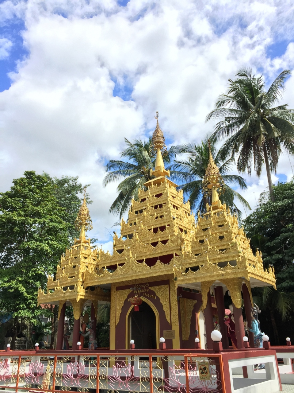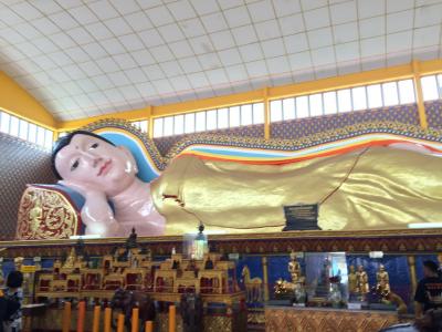 Reclining Buddha Wat Chaiyamangalaram向こうにある寺院。ピルマ建築と彫刻で、まるでタイにいる気分。奥に塔があって、階段はもちろん、エスカレーターも利用できる、最上階に登って、眺めがよく、爽やかな風がふって、気持ちよかった。