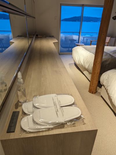 チェックインと食事は別館で、宿泊のみの棟の3階の海側の部屋に泊まり、貸し切りの露天風呂は4階でした。特典でお風呂の追加の貸切か1時間レイトチェックアウトがついていましたが、すでに夕食後風呂の予約をしていたので他の宿泊客の利用を考慮して追加の貸し切りは遠慮し、翌日予定があったのでレイトチェックアウトも利用せずでした。
