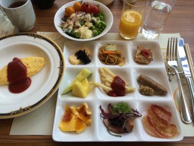 朝食はビュッフェ+シェフが目の前で焼いてくれるオムレツなど。種類多めで美味しくて満足です。一枚で9マスセパレートになってるお皿は味が混じらなくて地味に便利。