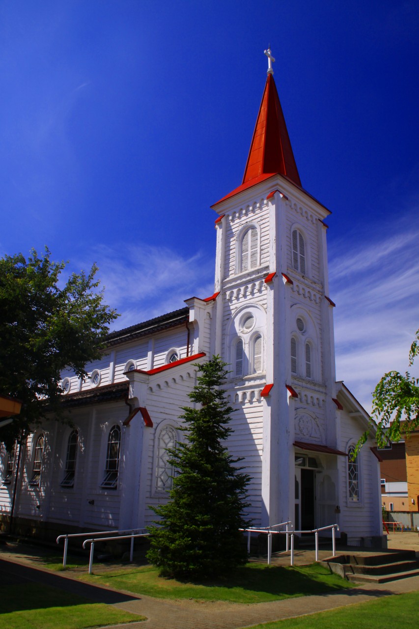 鶴岡市の中心部にある白亜の建物で、国の重要文化財にも指定されています。教会は無料で開放されており、内部にも自由に入ることができます。静かな堂内に安置されている黒い聖母マリア像は、世界的にも珍しいものだそうです。駐車場が近くにないため、市役所に車を停めて歩いて行くのが便利です。