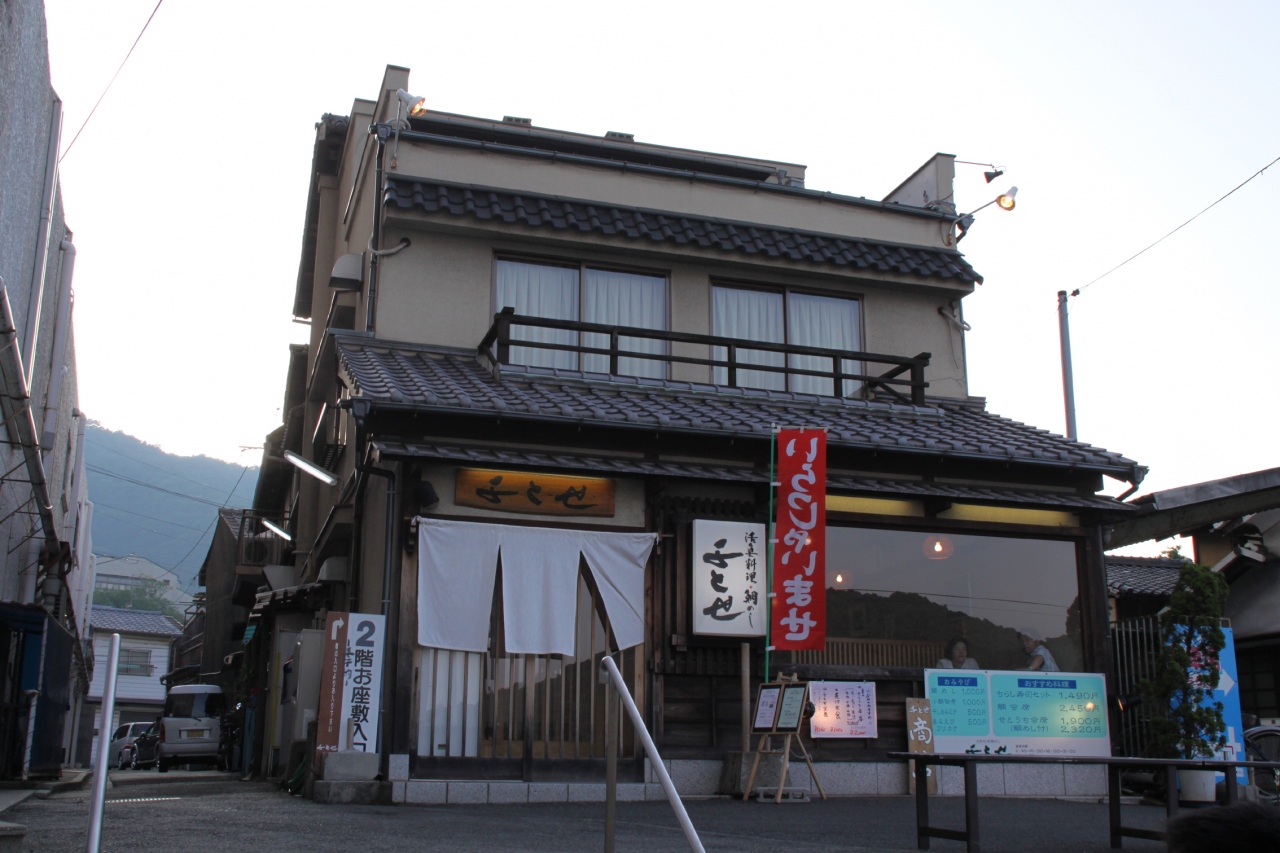 鞆の浦の福山市街地からの一本道。シーサイドホテル横の市営駐車場のすぐ西にあるレストラン。名物の鯛料理の会席を食べました。刺身やあら煮、鯛飯などがついています。値段も2千円から3千円ほどです。窓際の席からは鞆の海を眺めながら料理をいただくことができます。