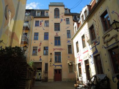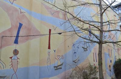 普通の一般家庭が生活している建物の中庭側の壁にテーマを持たせた芸術作品です。