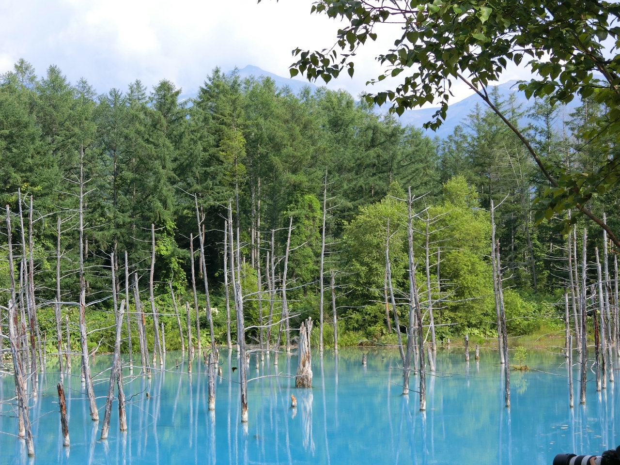 水質と太陽光が青くするのでライトブルーを見るのであれば晴れた日に限ります。風がないと水面に木々や山が映りこんでより美しいと思います。池の周りの小道は狭いので一方通行な感じで帰りは一段上の道を戻ってくるのですがそこからも池が見えるポイントがあります。小さな売店とトイレもあります。