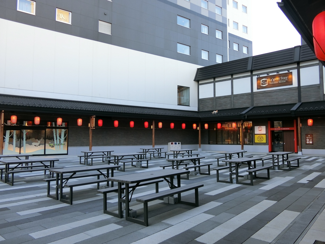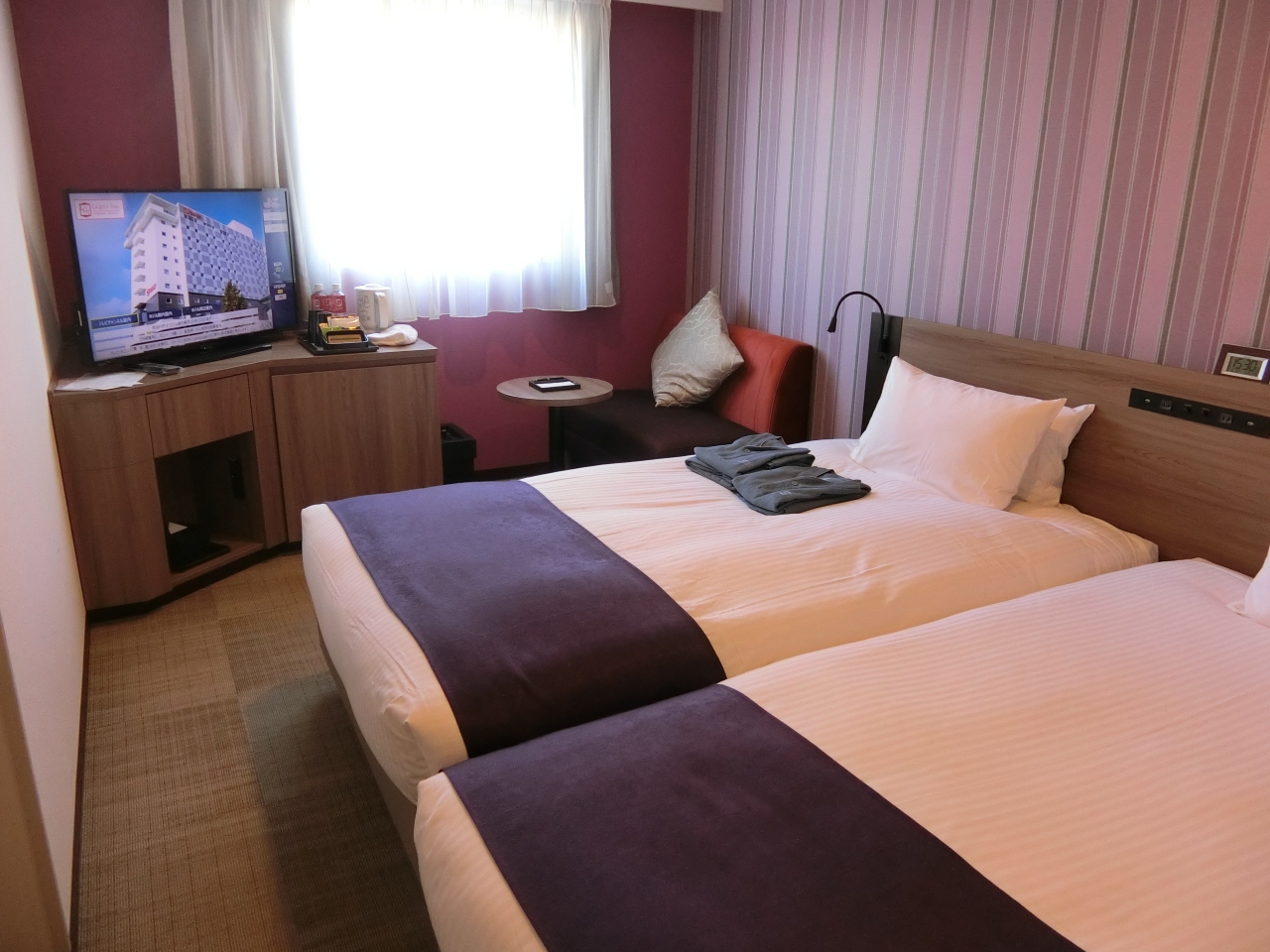 コンビニ、ジム、飲食店、土産物店などの複合商業施設ハコビバの中にあります。部屋は広いとは言えませんが充分な設備で新しいのが嬉しいです。雨で靴が濡れてしまいこちらの靴脱臭乾燥機で30分で乾いたのでとても助かりました。朝まで入れる大浴場はジムの利用者と共用です。混んでるとエレベーター待つかも。