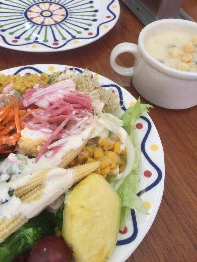 ランチタイムも終盤でしたが、主婦層が奥の席で賑やか。1人客は手前に通してくれるので、ブッフェ台も近くて便利です。