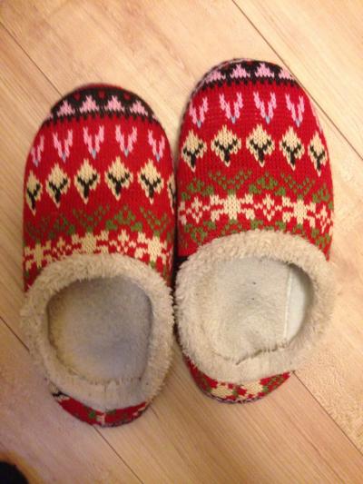 訪れた時にはちょうどスリッパが在庫限りの半額になっていて、左右の柄はアンバランスなもののかわいくて購入。
