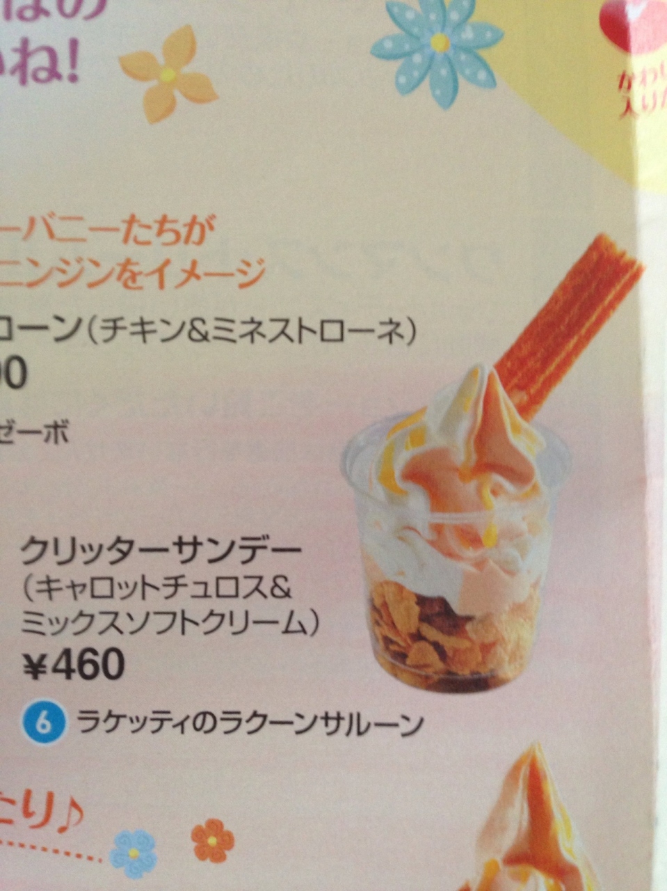 クリッターカントリー周辺で特に女性がチュロスのささったソフトクリームを食べていたので気になり、どこかと探していたところ、入園時もらったリーフレットの中にあったので、クリッターカントリーに向かった際に買いました。