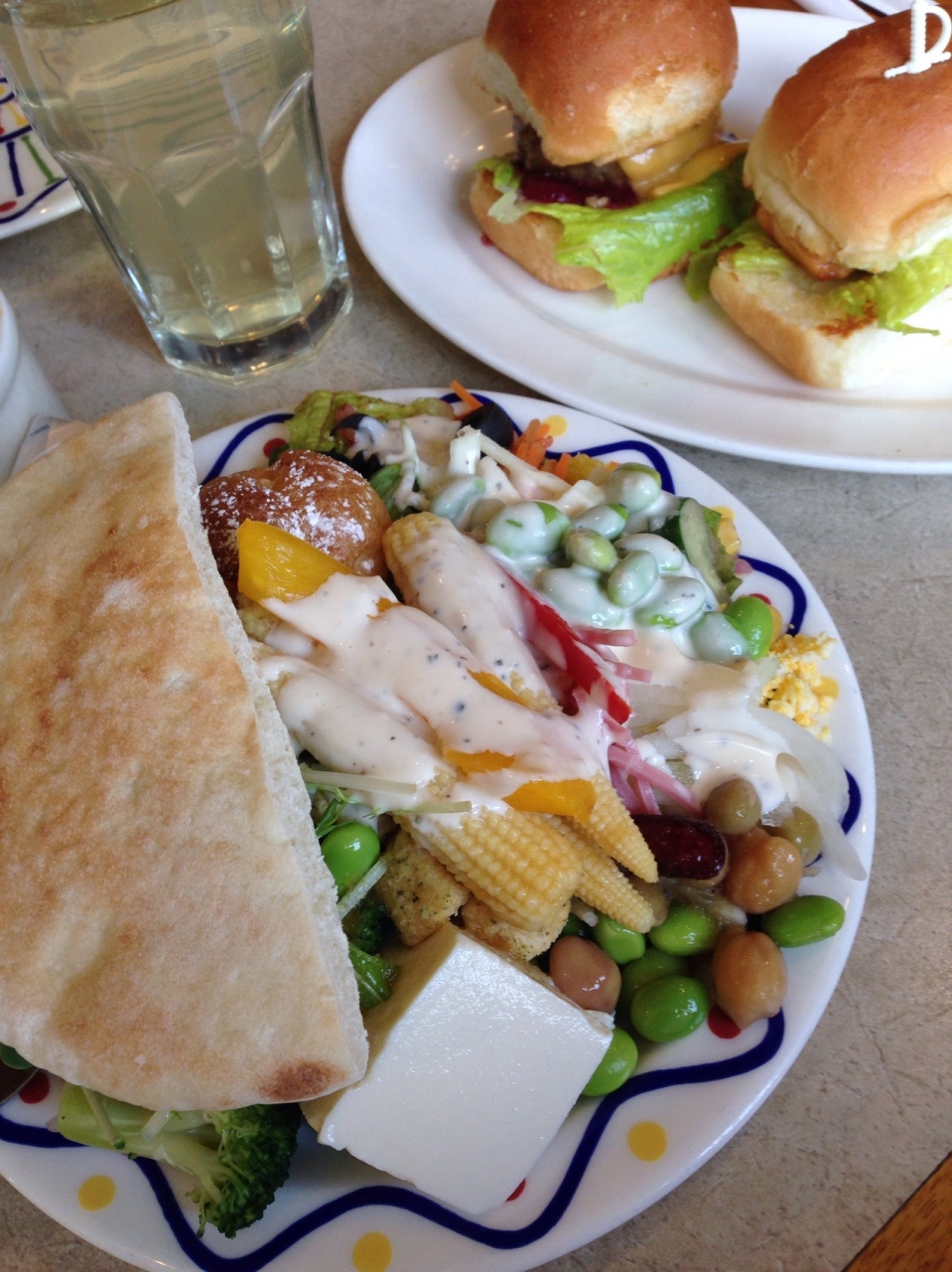 サラダなどのビュッフェがお皿2枚分、スープが1回、ドリンク2杯、デザート1回のランチエクスプレスに、380円のミニハンバーガーを頼みました。