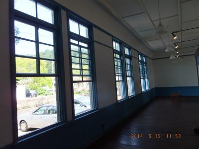 外観は、船底を逆さにしたようなめずらしい屋根で、広場に面する壁は、一面がステンドグラスになっていました。