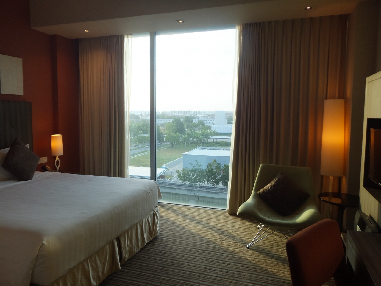 Expoの駅からホテルまでは徒歩3分程度の距離で、スーパー、コンビニエンスストアやレストランが隣接しておりますが、駅前ながらも静かな落ち着いた時間を過ごすことができました。客室の窓からMRTが行き来しますので、鉄道好きにはおすすめです。