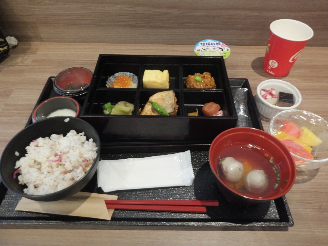 朝食は、和食または洋食のセットに加えて、一口サイズの小鉢(ラップ包装)をそれぞれ好みでテイクアウトする提供形式でしたが、このご時世にあって、衛生面と利用客の嗜好性を考慮したすばらしいサービスだと思いました。いずれも美味しくいただきました。
