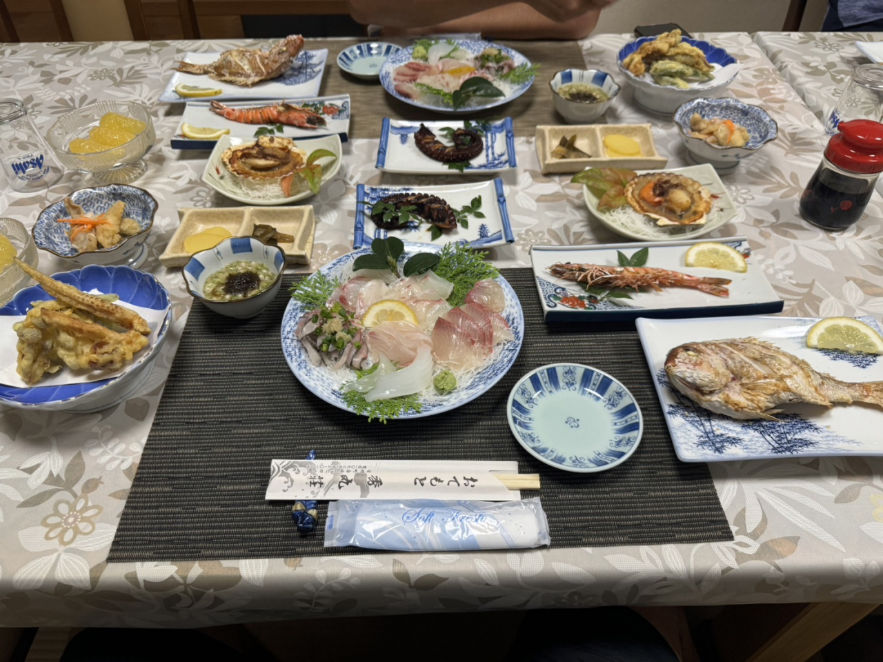 楽しみな夕ご飯、たっぷりのお刺身、タイの塩焼き(一匹)、車エビ、帆立、タコの煮物などなど地元の海の幸が満載です。
