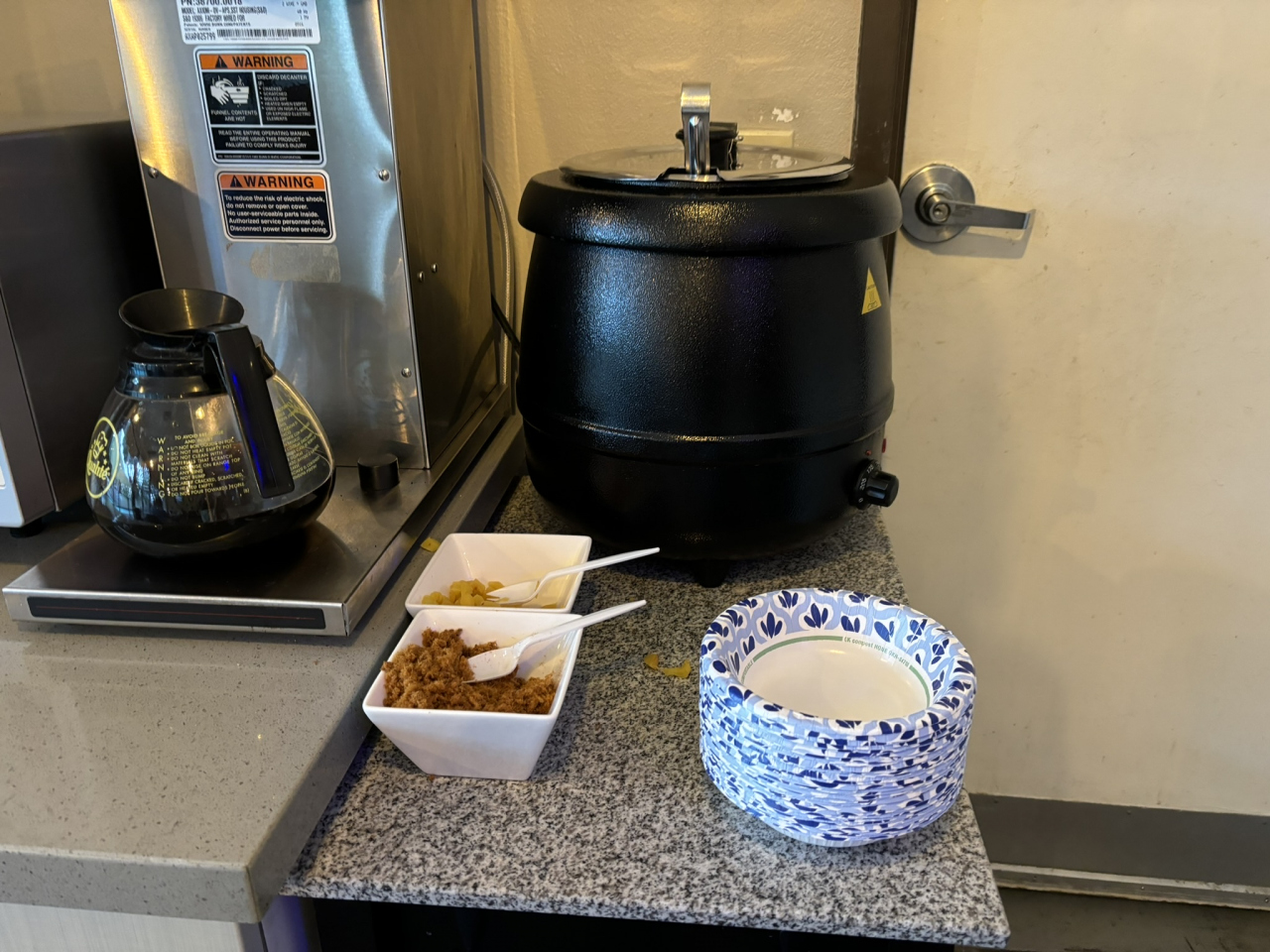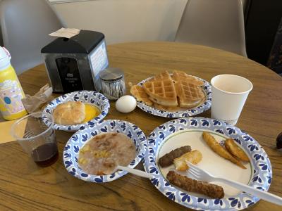 メニューはたくさんあって、主食は各種パン類、シリアル、お粥!も。