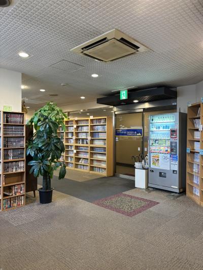 フロントはエレベーターで二階へ、マンガ本はたっぷり壁いっぱいにあります。