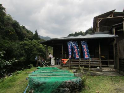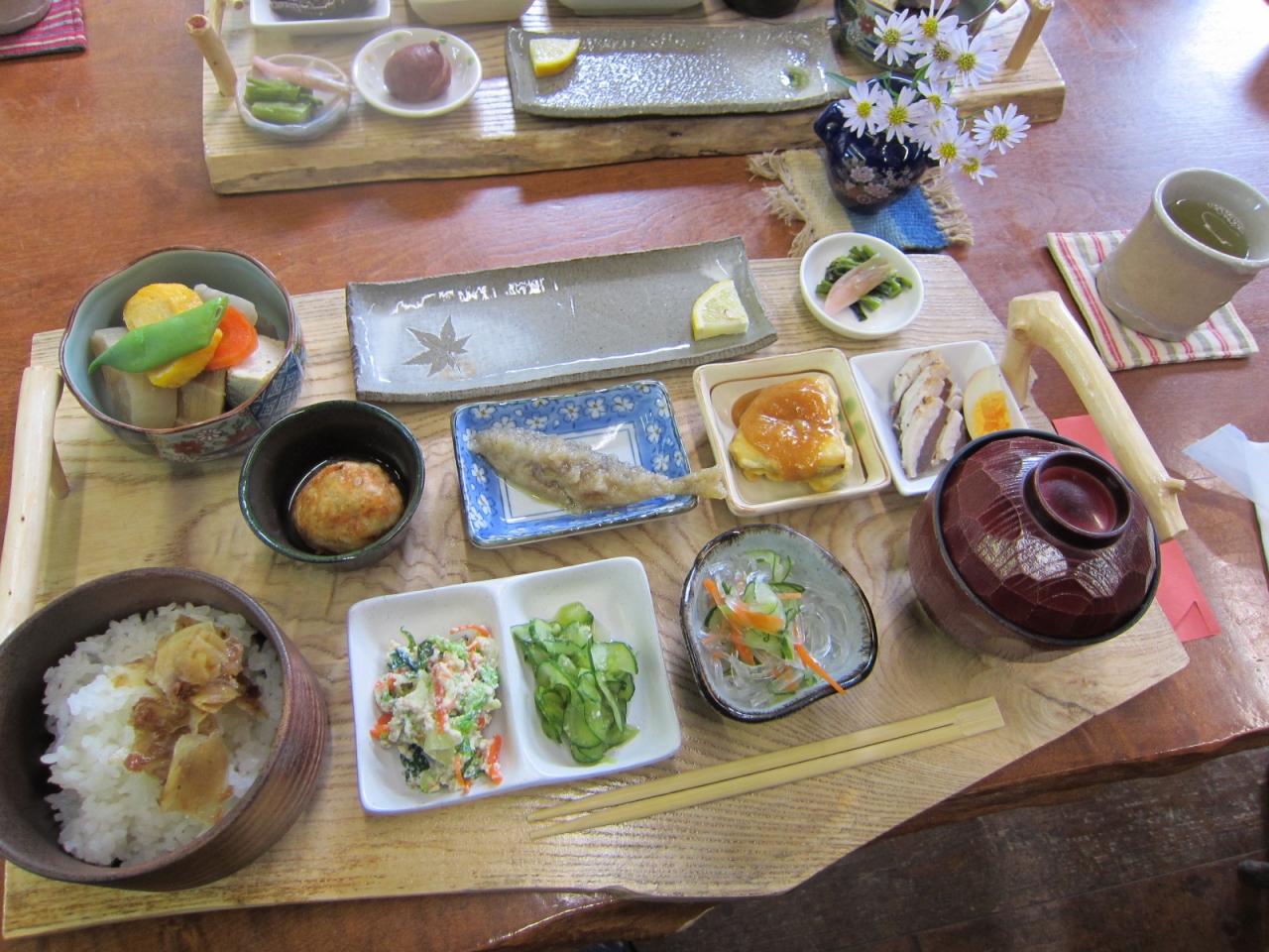 やまめの塩焼き、だご汁、ごはん、あえ物、酢のもの、鹿燻製などがついています。