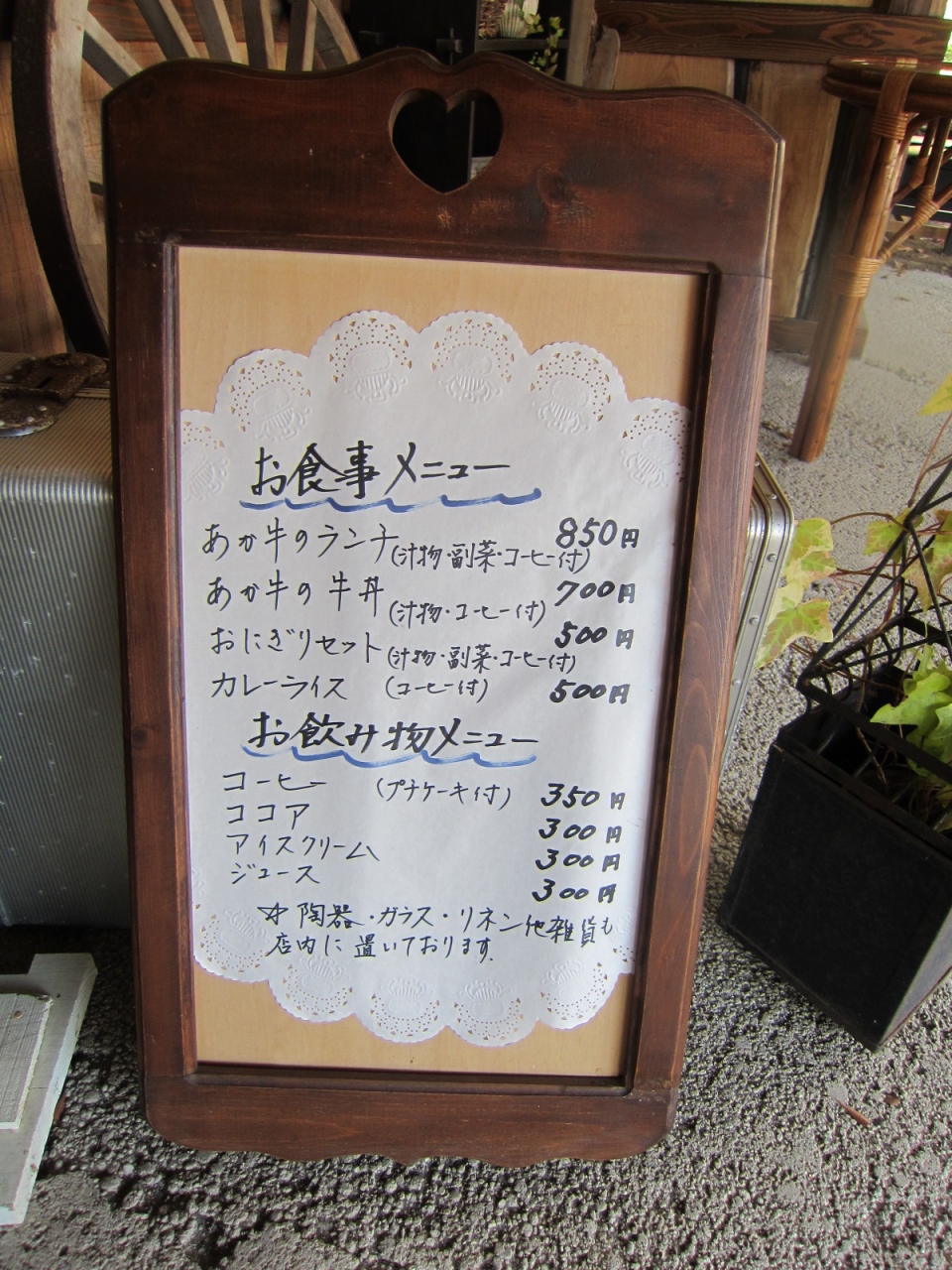 メニューはあか牛のランチ(汁物・副菜・コーヒー付き)、あか牛の牛丼、おにぎりセット、カレーライスなどです。