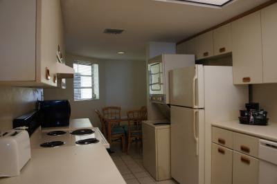 ドアを開けると左に食堂、フルキッチン、ランドリー、ドライヤー。