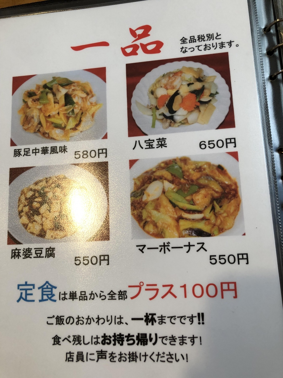 単品にプラス100円で定食(ごはん、玉子スープ、ザーサイ、サラダ)にでき、ご飯はもう一杯までは無料です。