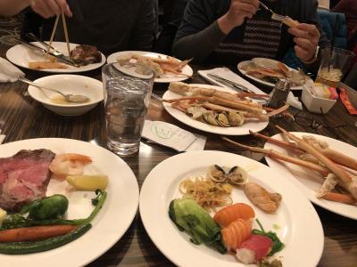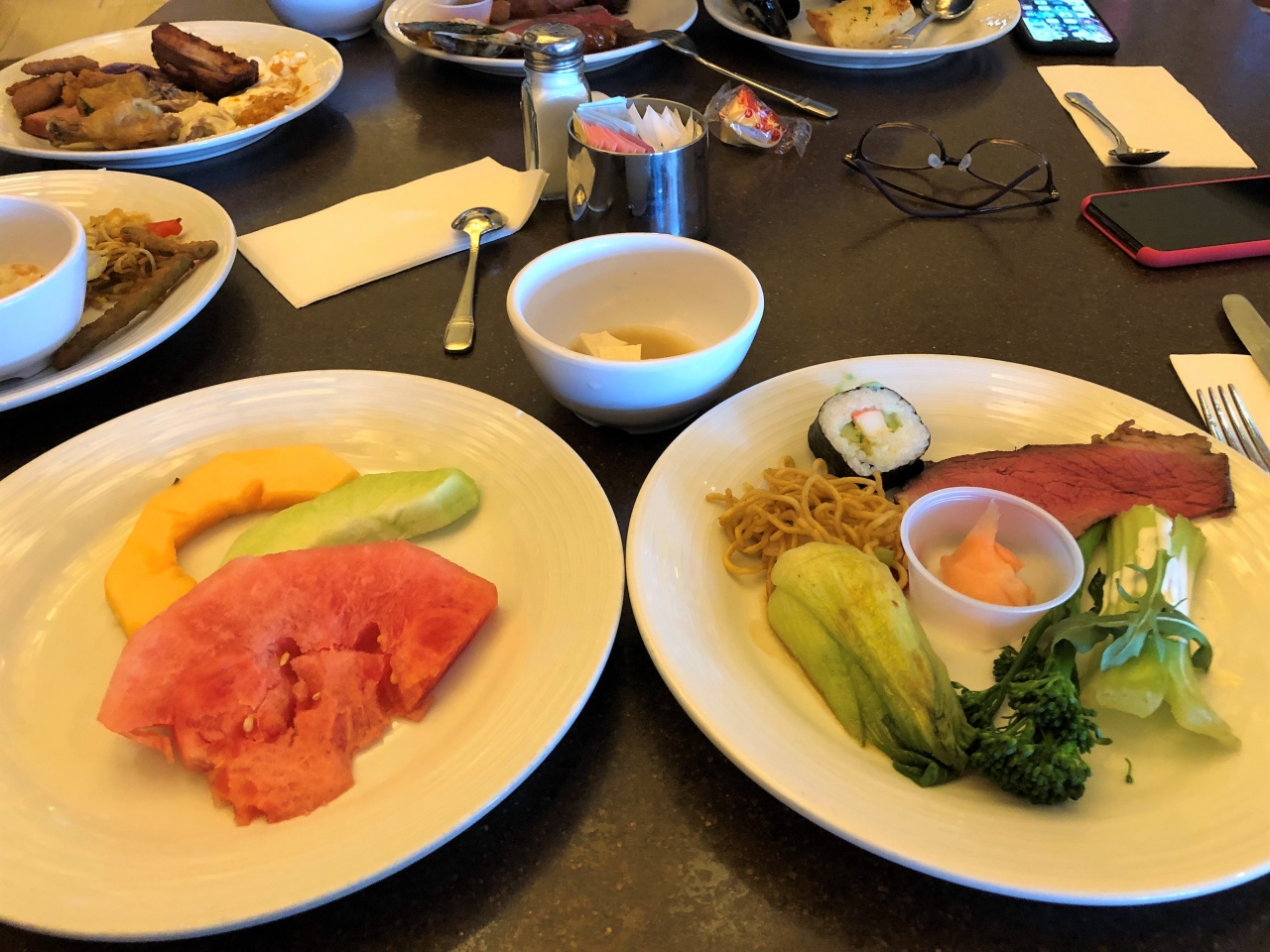 色々おいしそうなものをお皿に、カニ塩辛くて水っぽい、スイカは甘くない、
