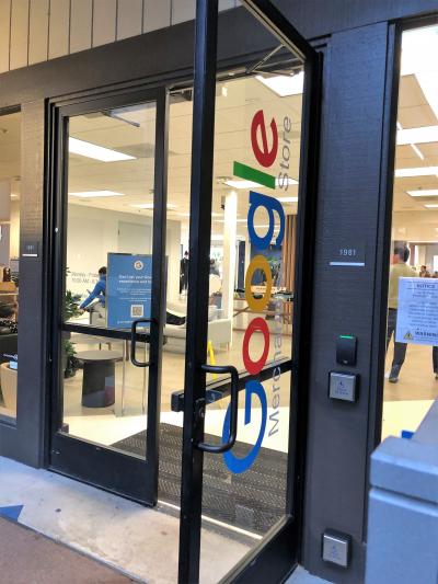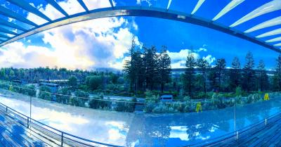 2階は目の前に円盤型の本社オフィスがあり、スタッフさんが特殊な技術で、アイフォンで3人をパチリ!とサービス。
