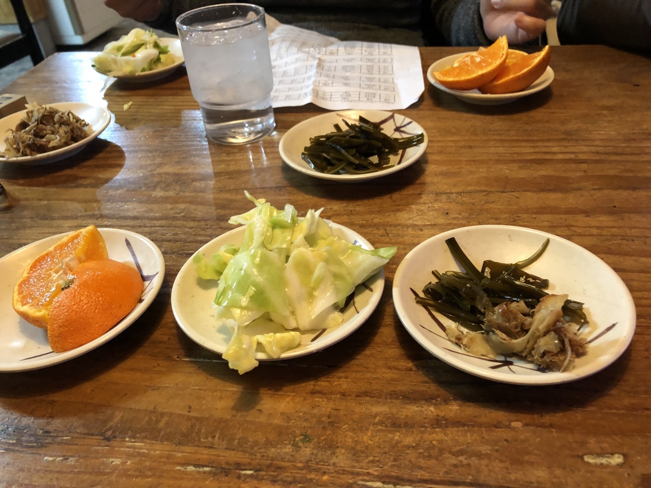 だしをとった後の昆布やカツオは佃煮にしてサービス、ほかキャベツの漬物やみかんなども好きなだけ。