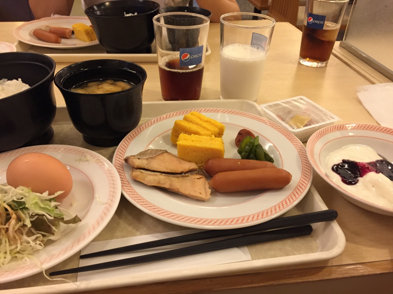 サービスの朝食は似たようなメニューではありましたが、お魚はさばと鮭が日替わりで提供されてよかったです。