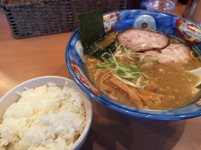 ご飯はサービスとのこと、ラーメンにはメンマ、チャーシュー、ねぎがのっていて