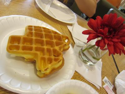 お部屋も清潔で広々、サービス朝食の時には、この州名物テキサス州の形に焼けるワッフルマシンがありました。