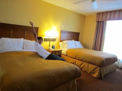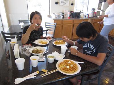 朝食もサービスで付いていて、自分で焼くワッフルが、孫のお気に入り。
