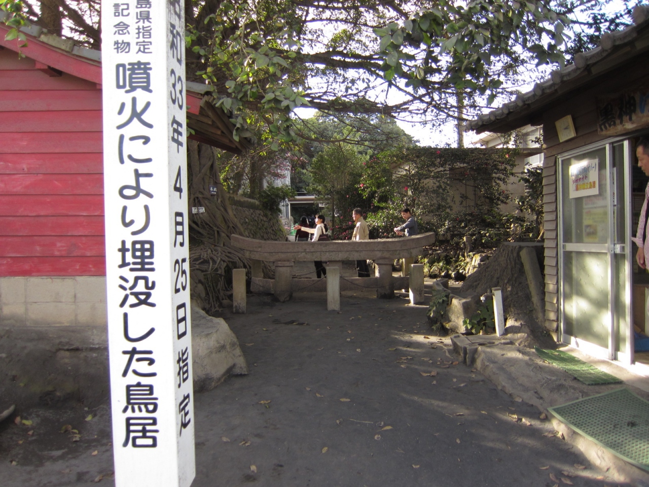 大正3年の大爆発の後、たったの一日で火山灰や軽石に埋もれてしまった鳥居(今は笠木を残すのみ)。