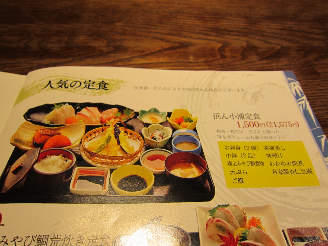 新鮮な3種盛りの刺身、みやび鯛の煮つけ、てんぷら、茶碗蒸し、小鉢2種類ほど、味噌汁、デザートも付いています。