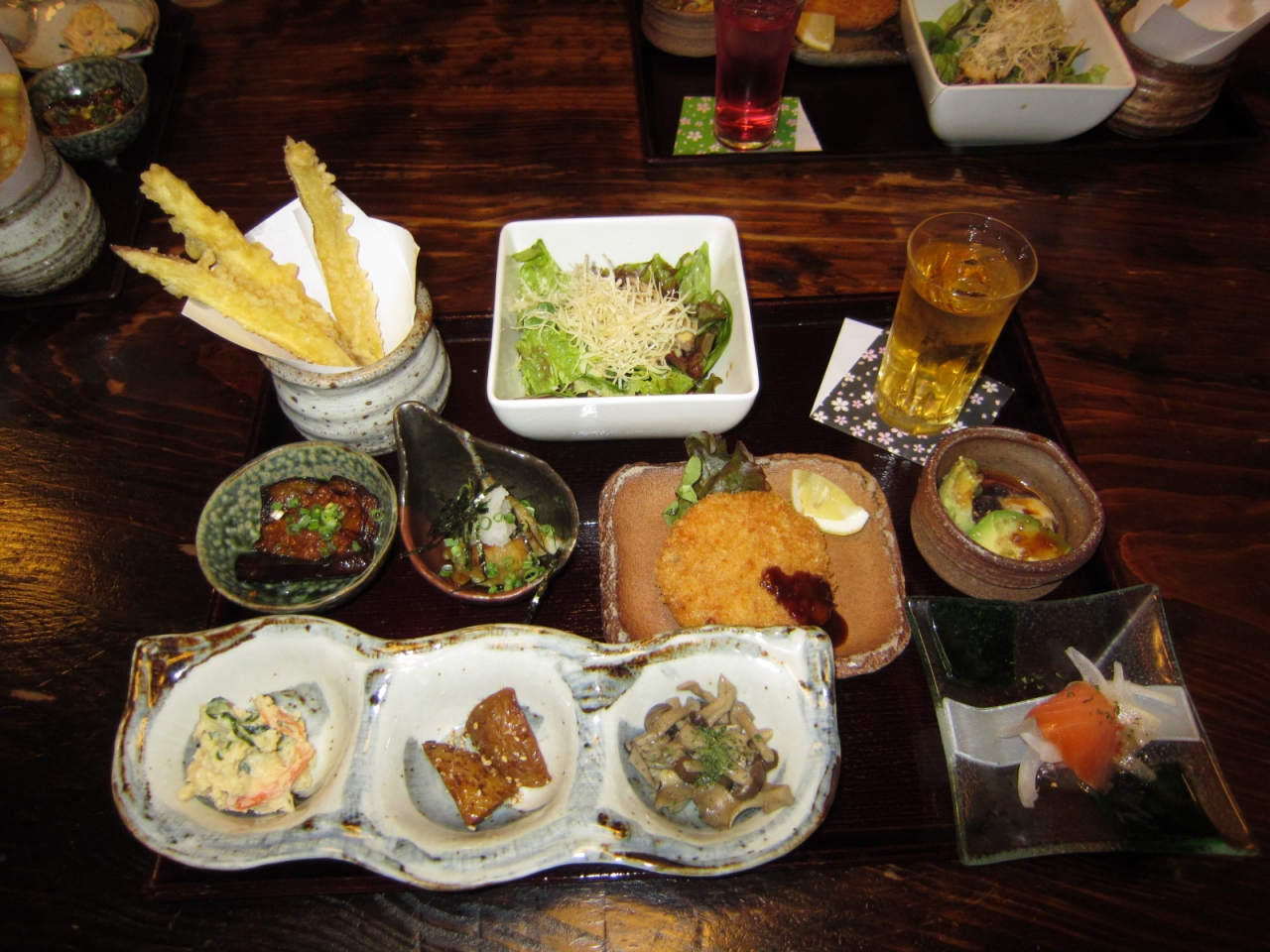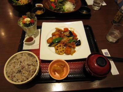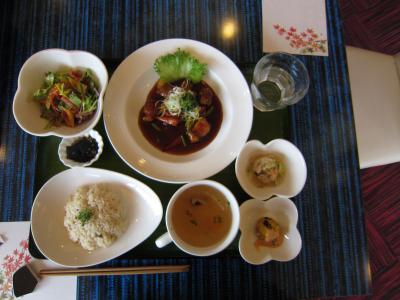 時間帯によっては待ち時間も必要な人気のレストランで、野菜料理をメインに、唐揚げ、豆腐、茶碗蒸し、煮卵等など、ご飯も3種類位、麺類、汁もの、デザートも数種類(近辺の名産ブルーベリーゼリーやぷりん、白玉など)お楽しみのメニューです。