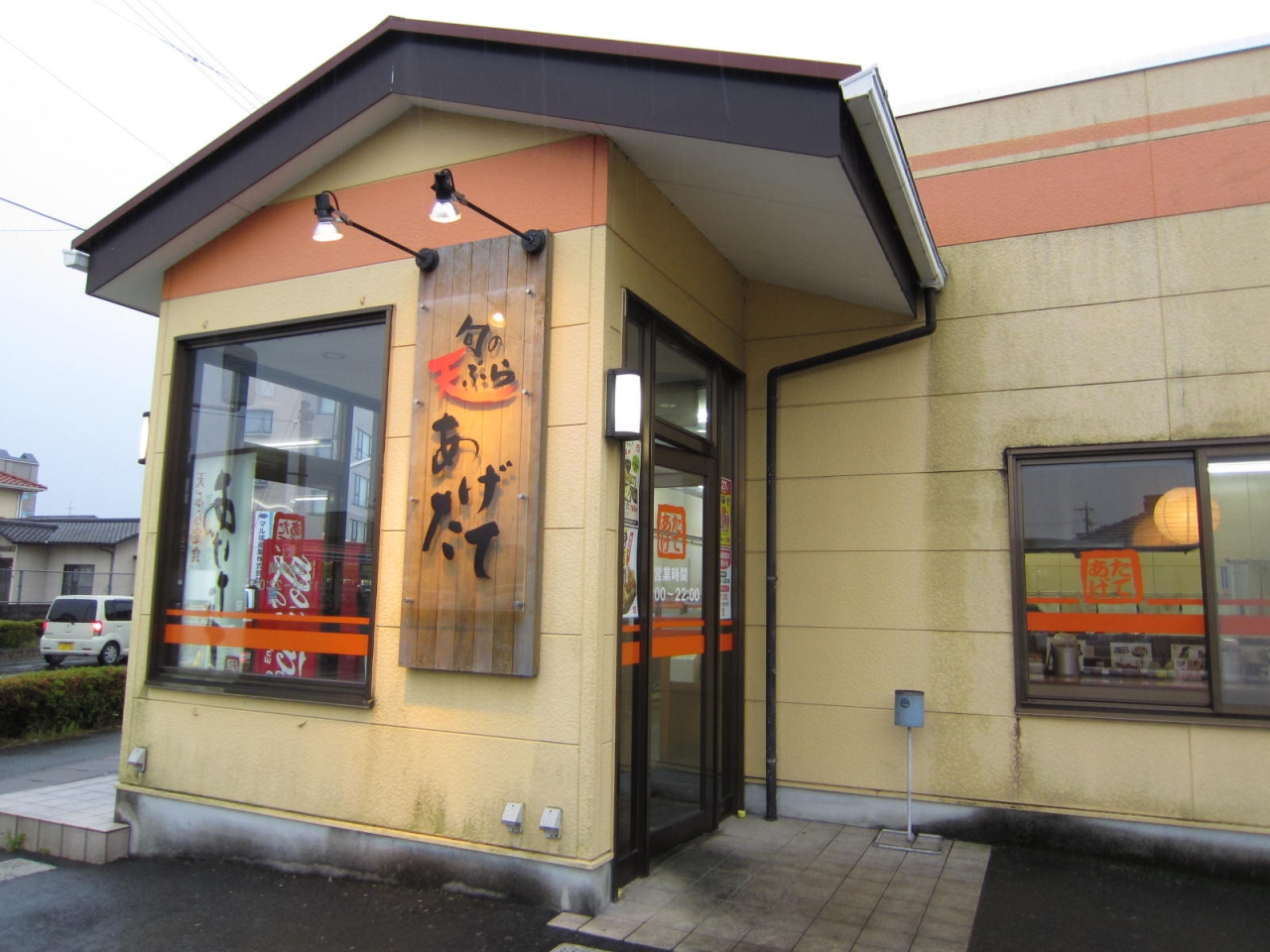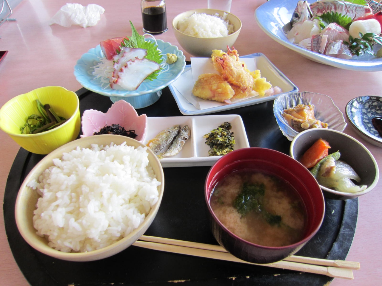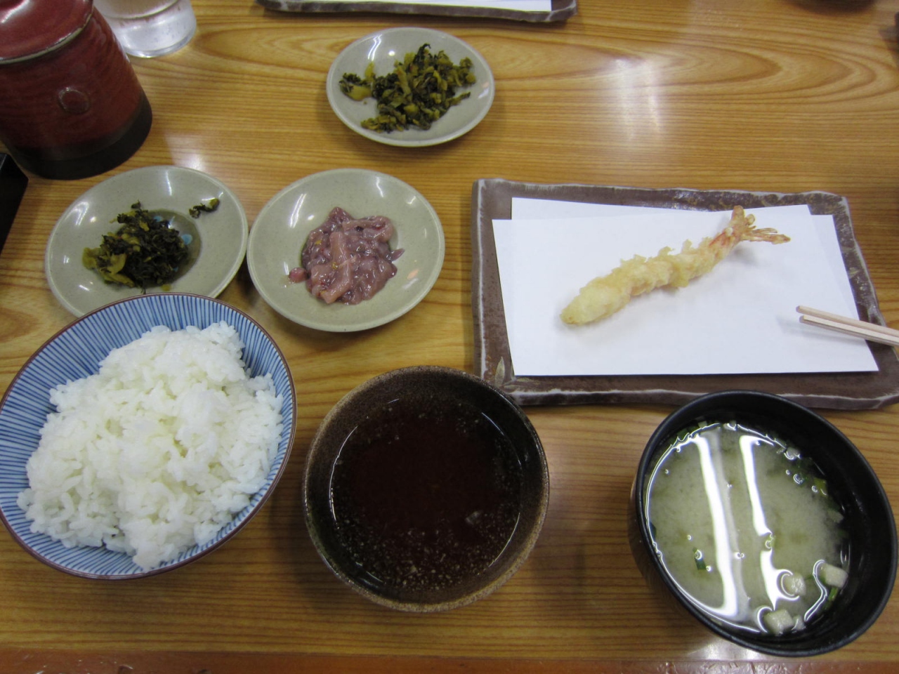 定食は、ごはん(お代わり無料)、味噌汁、7種類のてんぷら(内容は日によって変わります)海老・魚類・野菜類等など、それに高菜の漬物、イカの塩辛は食べ放題です。