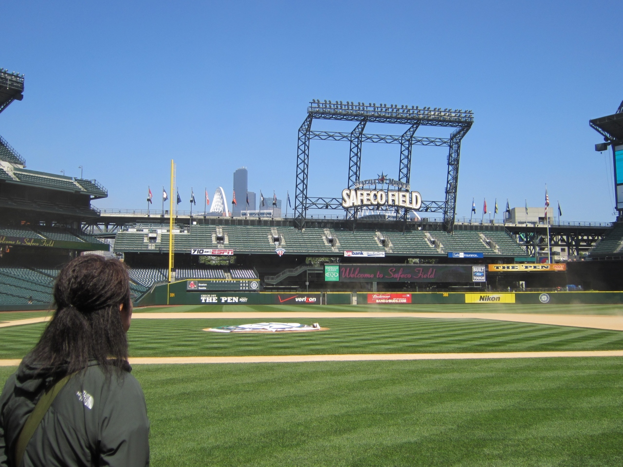 この時点ではイチローもいましたので、ダグアウトではベンチの穴(イチロー専用バット置き場)なんかもさわれますし、写真もOKです。