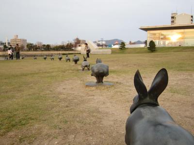 庭にでますと、うさぎのモニュメント、先頭から2匹目がパワーうさぎだとか。