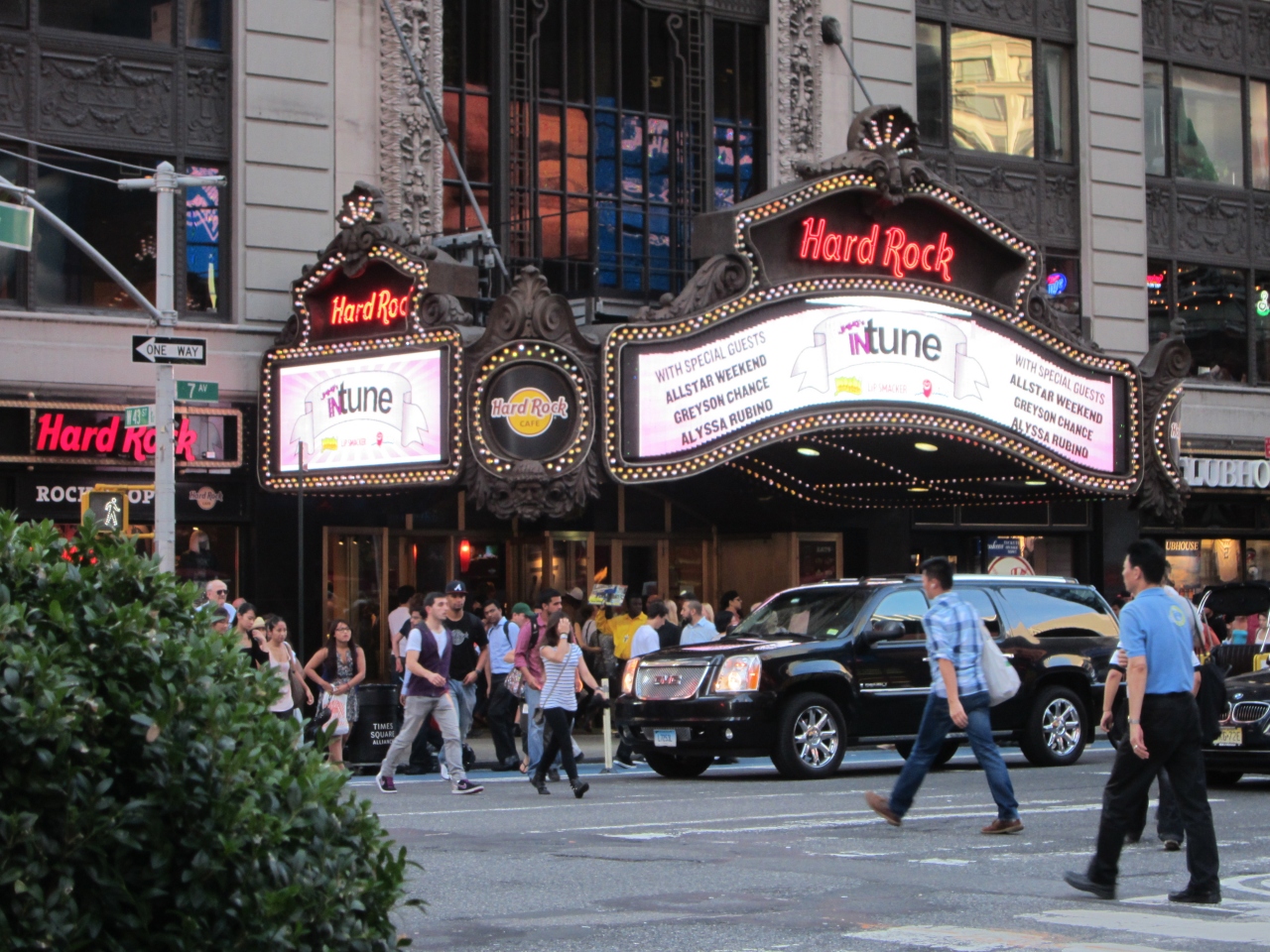 ブロードウェイの散策につかれたら、ここでアメリカンな食事やロック音楽を味わいましょう。