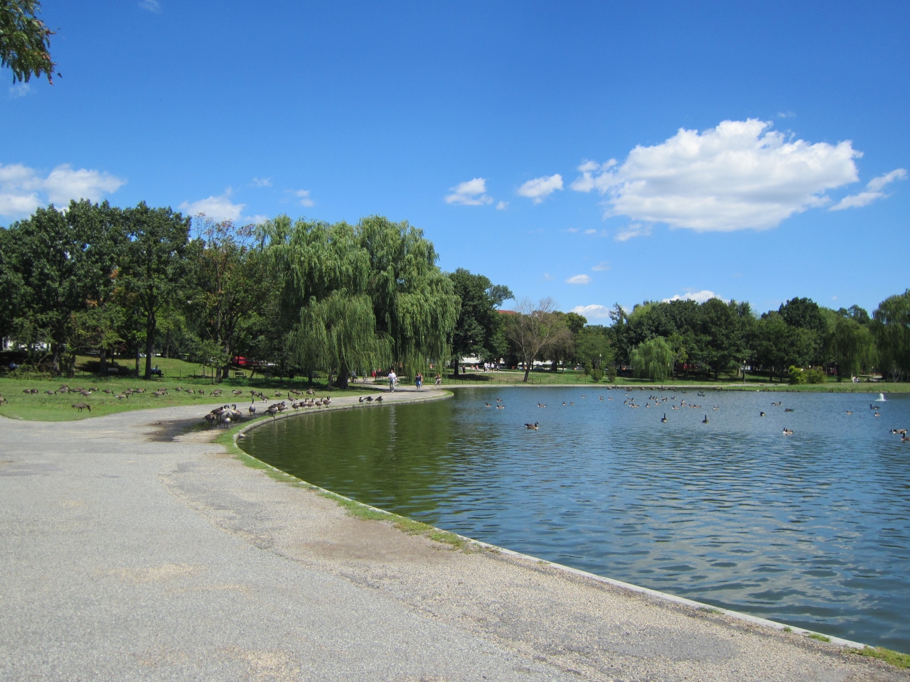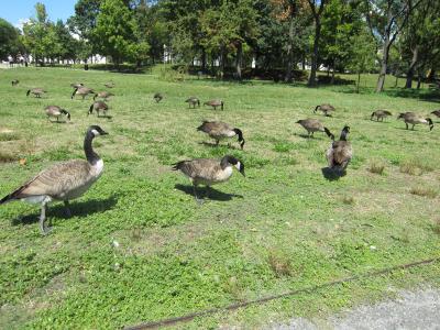 小さな島と池にはたくさんの鳥(かるがも?カナダ雁?)さんたちが…