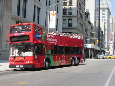 ニューヨークの街並みを散策していると、よく目にするのが、赤いボディーに色んな広告をペイントした2階建てバス。