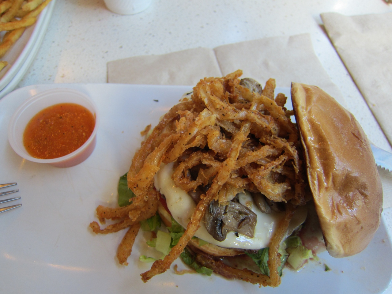 カリッカリッのオニオンやベーコンがバーガーにのっています。