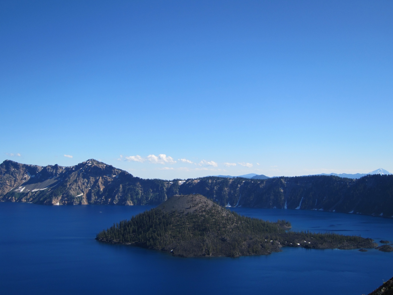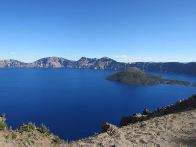 オレゴン州唯一の国立公園で、火山噴火でできたカルデラ湖になり、当時の山頂は湖の中に今でもポツンと残っています。