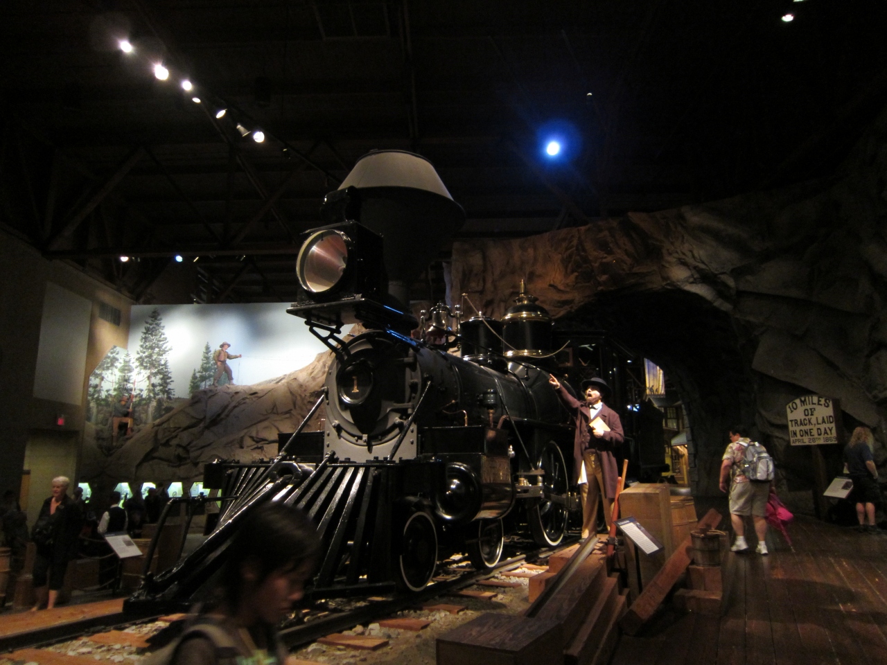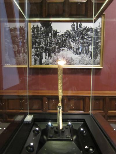 1869年5月10日、アメリカ史で東と西を結ぶもっとも重要な日、アメリカ大陸横断鉄道の最後のピンも展示されています。