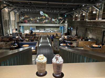 近未来的な店内ディスプレイ、二階席もありました。入口のセルフ注文の端末...
