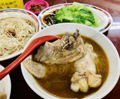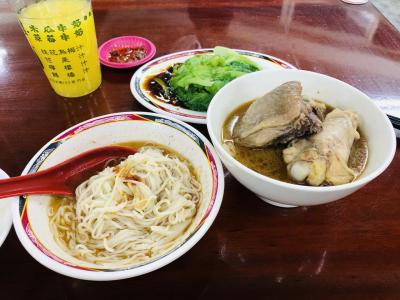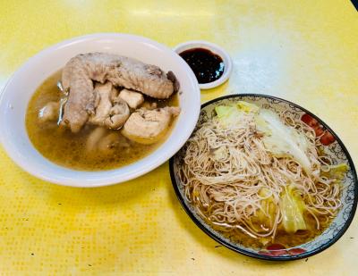 麻油雞+麻油麵線です。ごま油と米酒、生姜が効いた鶏肉のスープです。台湾...