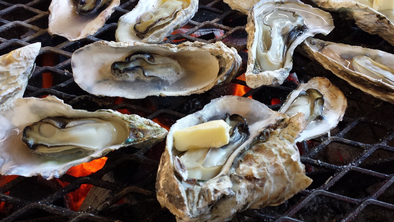 1人100円を支払うと持ち込みが可能になります。カキ以外にもホタテ、海老、アワビなどの魚介類からソーセージ、焼おにぎりまで売っていました。レモン汁、醤油、酢醤油、塩胡椒、焼肉のタレなどは置いてあります。匂いが服につくので上着は車に置いていくのがオススメです。