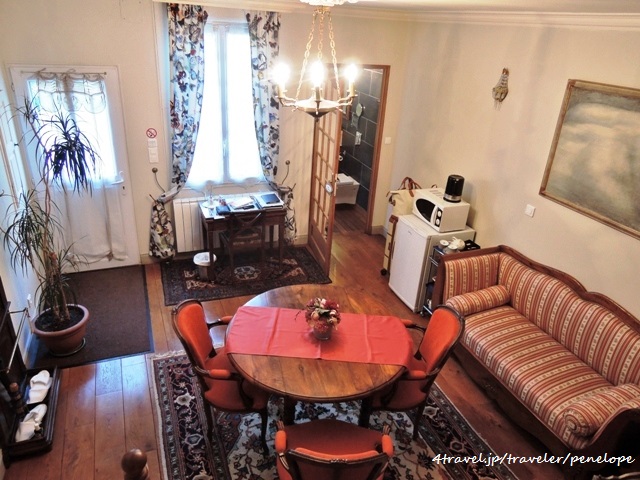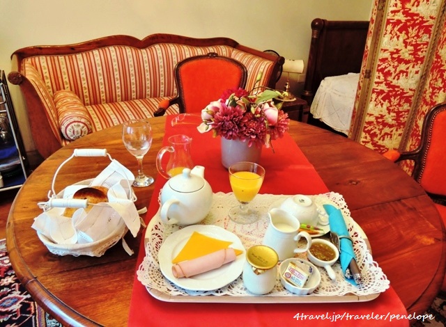 朝、奥様が部屋まで運んで来てくださいます。素敵なアパルトマンの部屋での朝食は、1泊でもその町に暮らしているような気分になります。これまで色々なところに滞在しましたが、唯一こちらだけ、カフェオレ用のミルクが冷蔵庫から出したての冷たいミルクでした。細かいことは気にしないのですが、この時ばかりはホットをリクエストすればよかったと心底後悔しました。