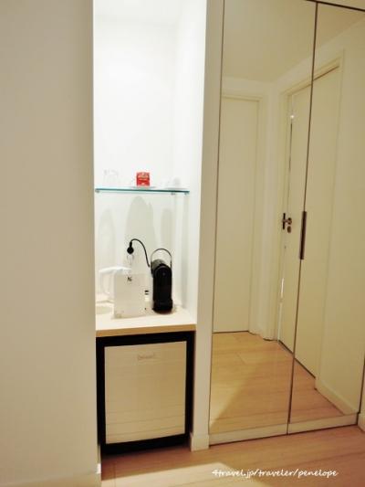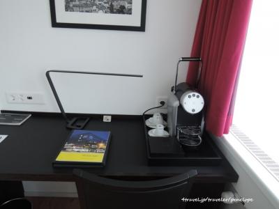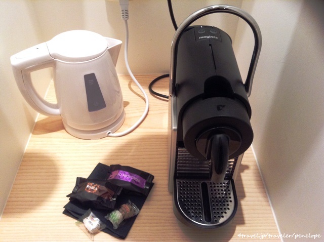 宿泊したシングルルームはモダンなインテリアでまとめられ、シーティングエリアのソファもベッドも快適。デスクにはネスプレッソがあり、数種類のコーヒーがセットされていて、コーヒー好きにはうれしいサービスです。