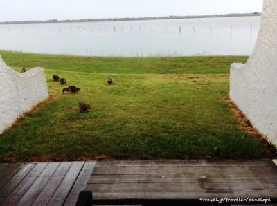 部屋はすべてレイクビューで、部屋の目の前に湖が広がります。朝には鴨も遊びに来ます。車は部屋の専用カーポートに停められます。