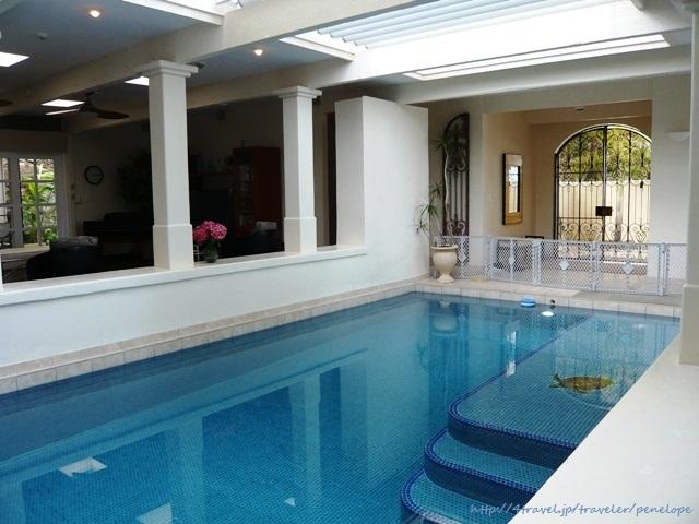 部屋の内訳は、寝室3(それぞれバスルーム付き)、リビング2、ダイニング2、それと家事室、キッチンがあって、屋内プールがあります。