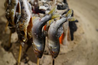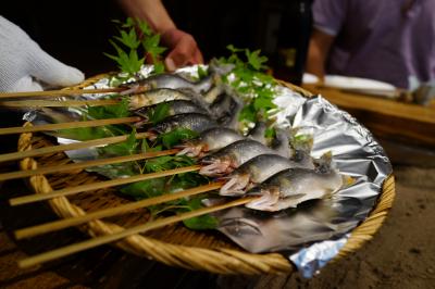 子鮎の塩焼き:正面水槽で泳ぐ子鮎を掬い塩焼きに、写真を撮るのももどかしいほど鮎のイイ香りが
